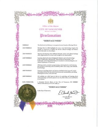 Vancouver Heritage Foundation presented an evening of storytelling from the Places That Matter project, hosted virtually through Zoom. Our 5th annual community celebration featured Musqueam community members, the reading of the Heritage Week 2022 Proclamation by City Council and special guest speakers on Vancouver’s places that matter.